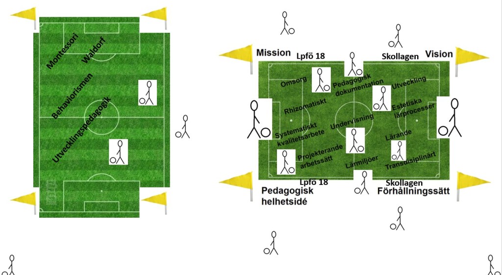 För de som inte varit med i min dialog med mina medarbetare kan uppleva mig som brutalt hård och rak när jag påtalar att medarbetarna skall vara ärliga mot sig själva och fråga sig ”vill jag verkligen arbeta utifrån Reggio Emilia filosofin?” Annars…är det bättre att söka ett annat arbete! Jag använde min fotbollsplan under förra APT när vi även knöt på medarbetarenkäten, men nu hade jag fyllt den med både spelar på fotbollsplanen och utanför samt till och med att några spelade på en annan plan. Detta är inte att jag vill att kompetenta pedagoger skall sluta OM de vill arbeta utifrån Reggio Emilia filosofin men jag VILL faktiskt att de slutar om de INTE vill det, för ingen kommer bli lycklig av att den/de pedagogerna stannar i något som man inte vill. Det är inte bra för pedagogen, det är inte bra för barnen och jag får många fler gråa hårstrån över att försöka ”övertala” någon att arbeta på ett sätt som hen inte anser skapar en förskola av hög kvalitet. Så var ärliga mot er själva säger jag, och det gör jag utifrån att jag vill att alla skall älska att arbeta på detta sätt lika mycket som jag älskar det och annars så önskar jag hen mycket lycka till någon annanstans. No hard feelings 🙂 !