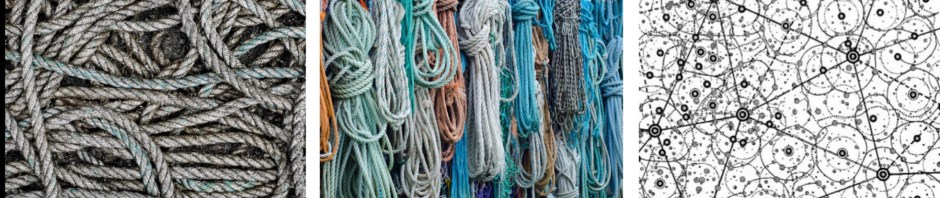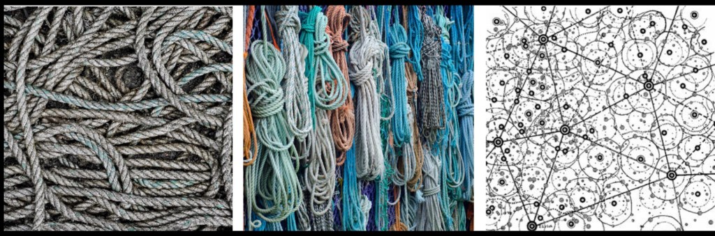 Bilden på repen handlar om att när man ska börja lyssna på barnen så pågår så många olika processer bredvid varandra. Vissa tycker att det är synd att man ska gå in att styra dessa processer medan andra vill styra upp. Alla dessa processer som pågår och det lyssnande som ska fortgå för att kunna utkristallisera vad barnet/barnen undersöker och utforskar kan skapa oreda hos många pedagoger som då väljer att dela upp allt i ämnen, områden och att arbeta målstyrt (= bilden i mitten med repen som hänger fint uppdelade), det vill säga enligt min tolkning ett linjärt arbetssätt som inte handlar om att man som pedagog ”går bredvid” barnen och tillsammans utforskar. Där pedagogen inte är den som vet allt utan lär tillsammans med barnen. Där pedagogens egna tankar och egna planerande inte tar överhand över barnens tankar och funderingar. Den sista bilden handlar om ett projekt. De stora punkterna handlar om större knutpunkter medan de mindre punkterna är mycket mindre knutpunkter. I projekten blir de stora knutpunkterna där de flesta barnen är med och intresserade medan ibland blir endast några barn intresserade av något inom projektet och det symboliseras av de mindre knutpunkterna. Det är enligt Martina av yttersta vikt att pedagogerna förstår att så kommer det att vara i ett projekt – ”vissa frågor bränner till mer”. Även vårdnadshavarna måste förstå detta påtalar Martina. Alla kommer alltså inte att vara intresserade på samma sätt hela tiden.