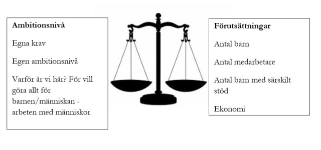 Under detta begrepp hamnar Krav och Förutsättningar samt att människan har rätt strategier att möta olika situationer, händelser och arbetsuppgifter. Är det balans mellan dessa två? En balans mellan dessa skapar ett optimalt arbetsklimat för alla anställda inom en organisation. Vad är ”rätt” förutsättningar inom organisationen förskola? Inom detta begrepp finns det mycket tyckande och tänkande från rektor, från medarbetare och från fackliga förbund, men VAD är ”rätt” förutsättningar och vad är att nyttja tiden på rätt sätt för att få maximal effekt av det man gör? Att göra mindre men rätt saker på ett systematiskt sätt under arbetsåret för att uppnå maximal effekt på det man gör är devisen för mig.