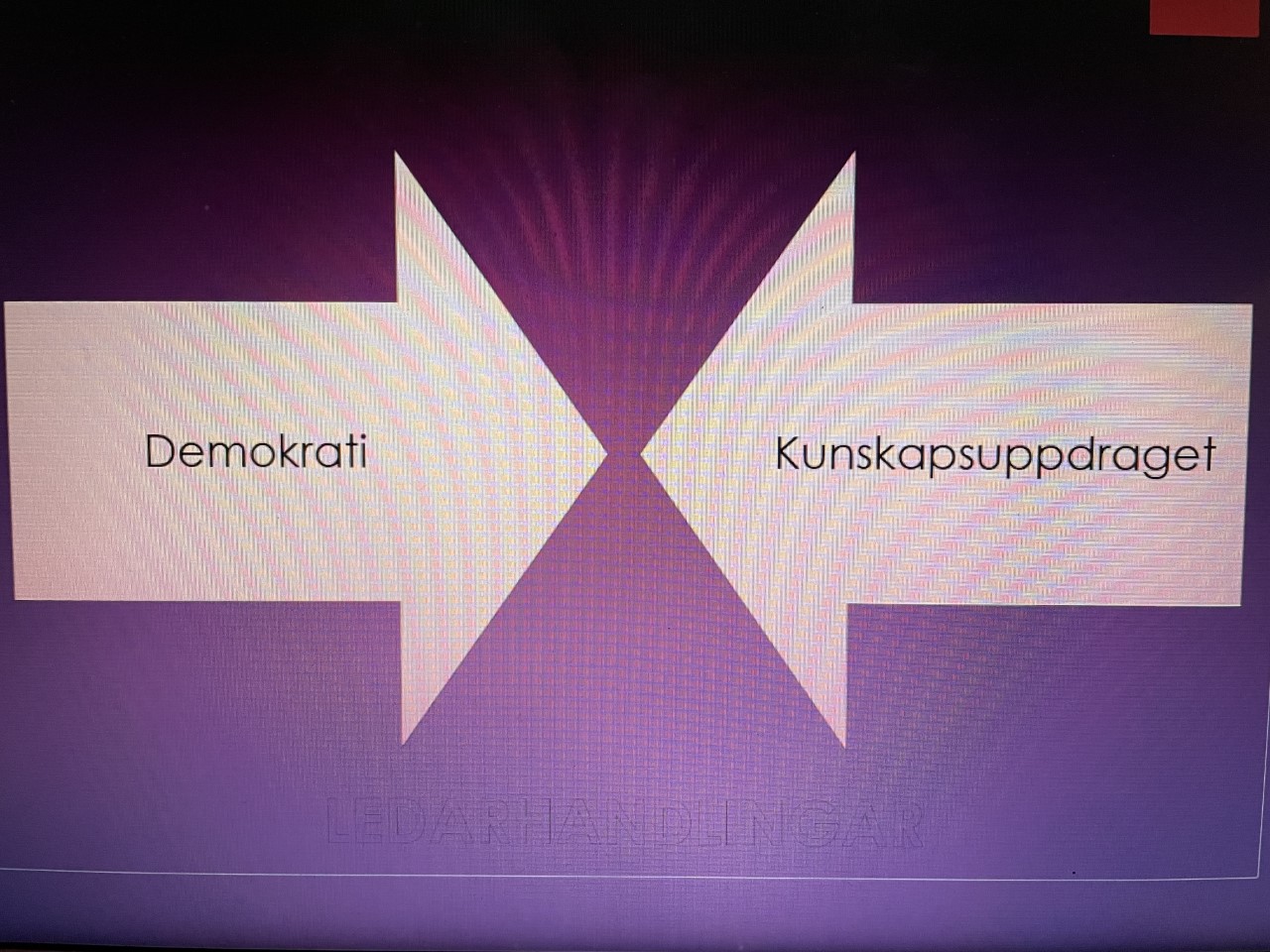 Kunskapsuppdraget är det som är i fokus i hela samhällsdebatten medan demokrati, delaktighet och inflytande blir ett område som sätts mot kunskapsuppdraget. Om vi istället skulle se dem som samspelande partners istället som att de arbetar mot varandra skulle barnen och elevernas gynnas enormt. Använd demokratiuppdragets glasögon när ni tittar på kunskapsuppdraget, vilken utbildning måste ni då skapa för att barnen/eleverna ska vara I en demokrati och att ni tillsammans skapar kunskapsuppdraget. Det som istället sker är att man tar demokratiuppdraget och förpackar det som ett ämne precis som matematik, svenska, naturvetenskap osv. Det är nu barnen/eleverna får LÄRA OM en demokrati, men om barnen/eleverna ska förstå vad en demokrati innebär måste de vara en del i hela det systemet genom hela sin uppväxt. Här kommer lärares tolkningen av uppdraget in och det har en stor påverkan på barnens möjligheter för utveckling och lärande.